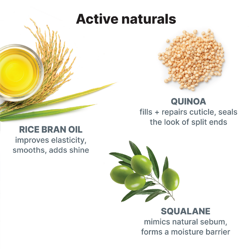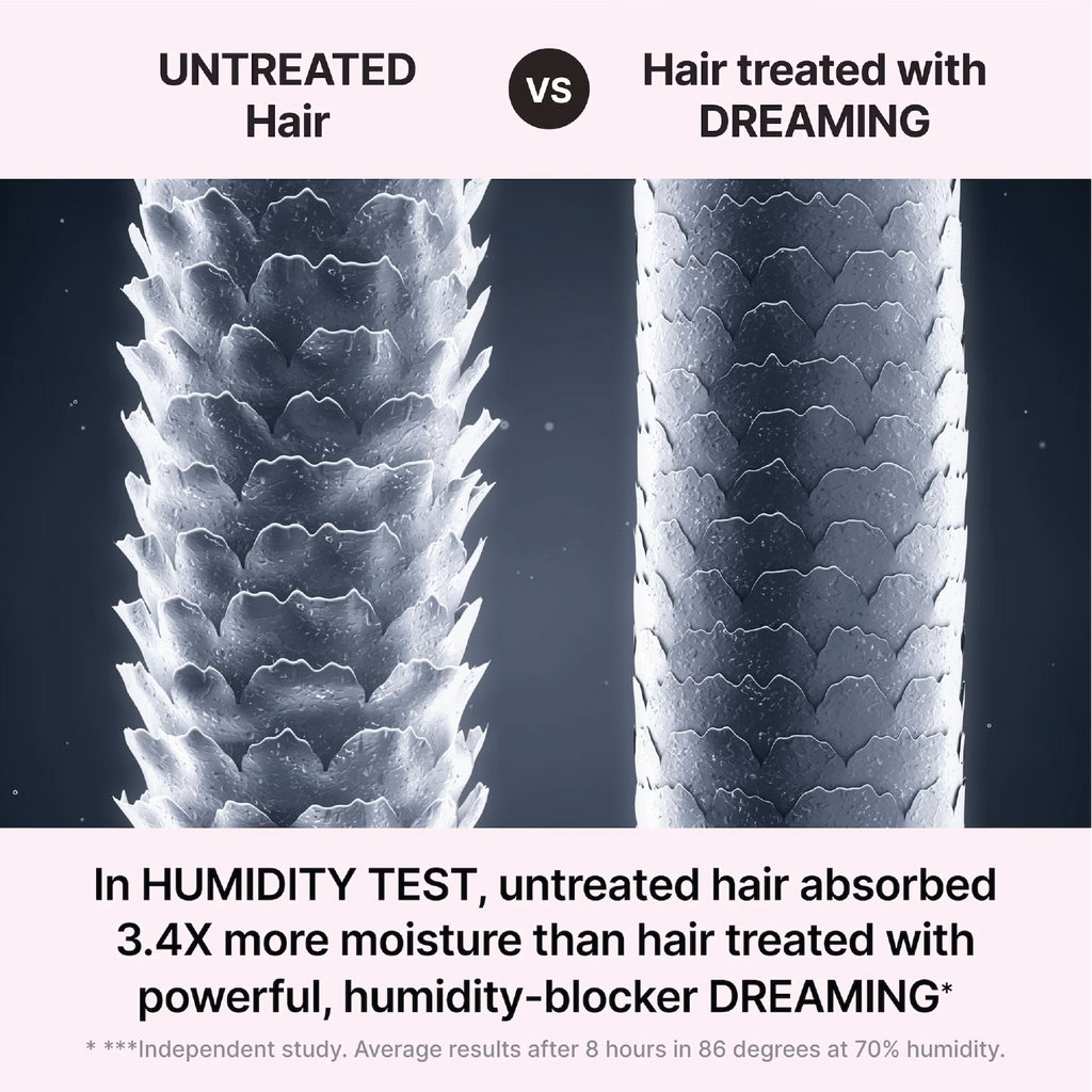 Formulated with a blend of oils (including squalene and rice bran oil) protein-rich quinoa and naturally derived polymers, DREAMING “melts” into hair’s outer cuticle layer, filling gaps, cracks and visibly repairing imperfections like split ends. In 3-5 minutes, DREAMING forms a strong, tightly sealed, “pseudo cuticle layer” that bonds to hair’s surface, providing a clear veneer of anti-humidity protection and smooth, glossy perfection.
